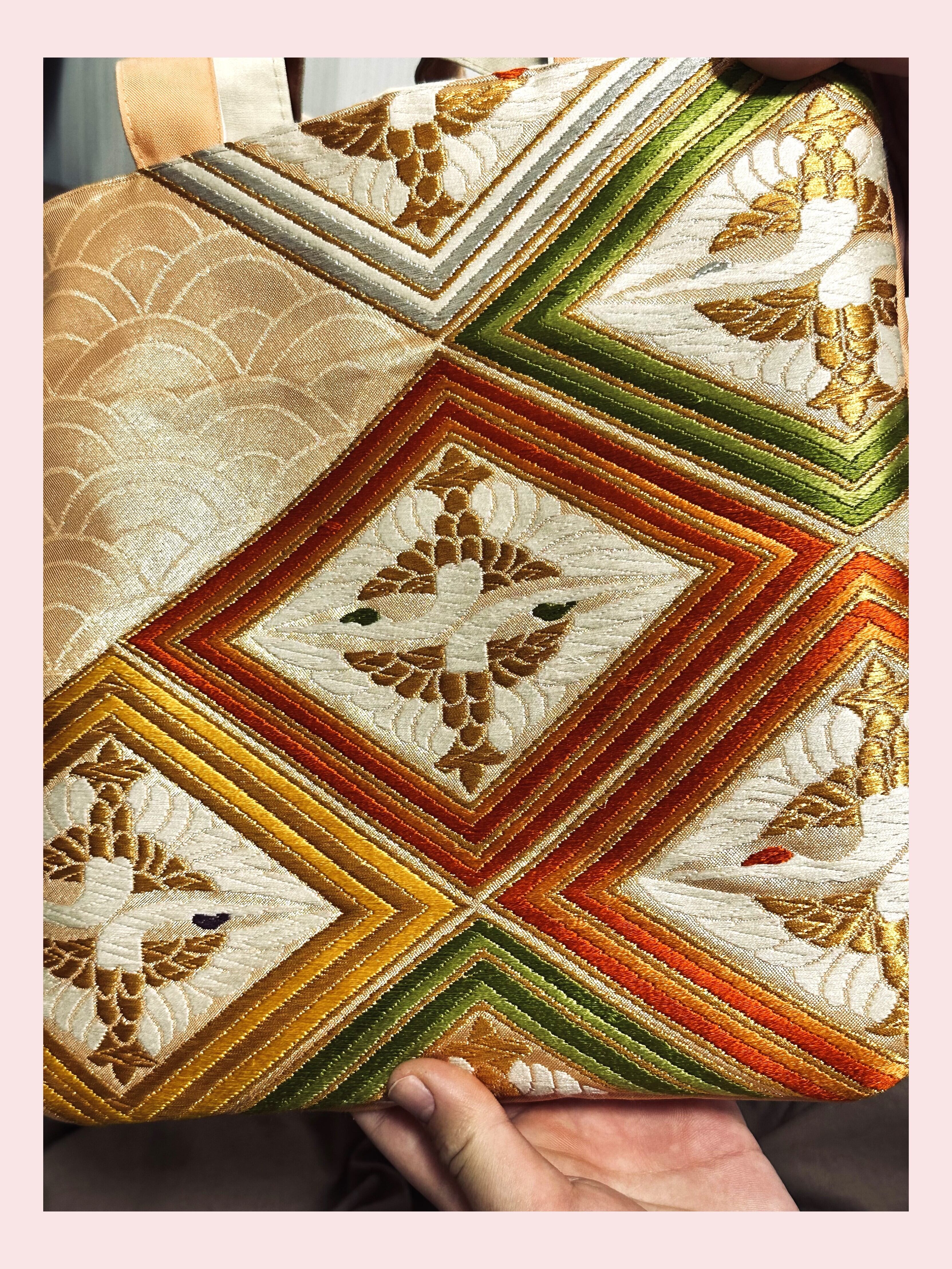 金刺繍が美しい、波模様の入った鶴モチーフの帯をリメイクして作りました。